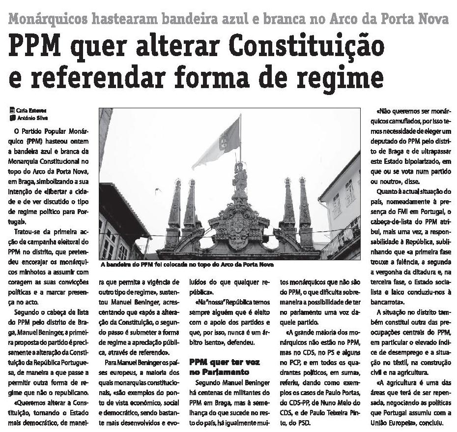 O Partido Popular Monárquico (PPM) hasteou ontem a bandeira azul e branca da Monarquia Constitucional no topo do Arco da Porta Nova, em Braga, simbolizando a sua intenção de «libertar a cidade e de ver discutido o tipo de regime político para Portugal».